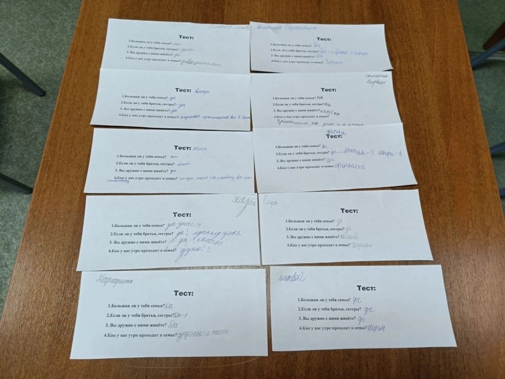 В конце встречи дети отвечали на вопросы теста «Я и моя семья»: о том, как собираются на работу и в школу, дружат ли со своими братьями и сестрами.