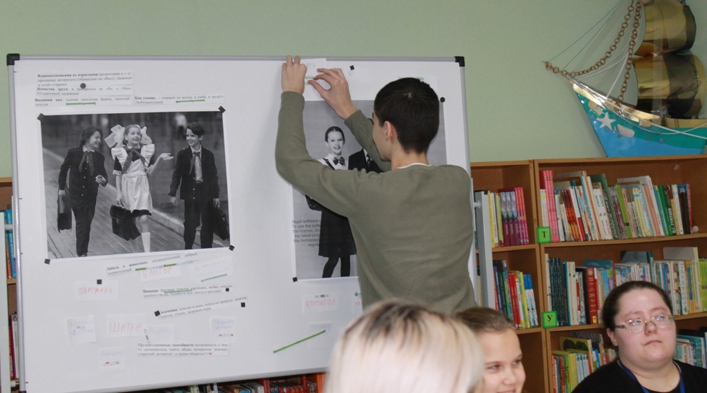 В помощь ребятам библиотекари предложили критерии для сравнения: внешний вид, навыки, увлечения и т. д. У каждого были ручки и листочки, чтобы в ходе обсуждения, находя отличия и сходства, можно было записать и прикрепить их на доску.