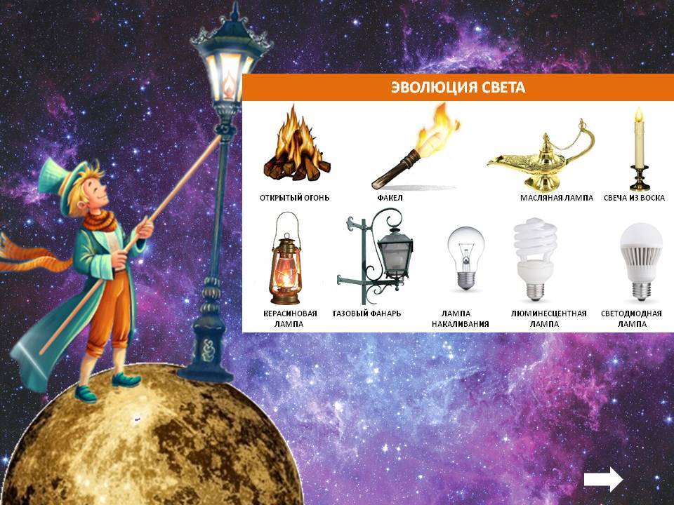 Когда люди научились добывать огонь? Из какого дерева изготавливали лучину? Какой жидкостью пропитывали факел? Что внутри электрической лампы загорается? На эти и многие другие вопросы мы получили ответы на планете Фонарщика.