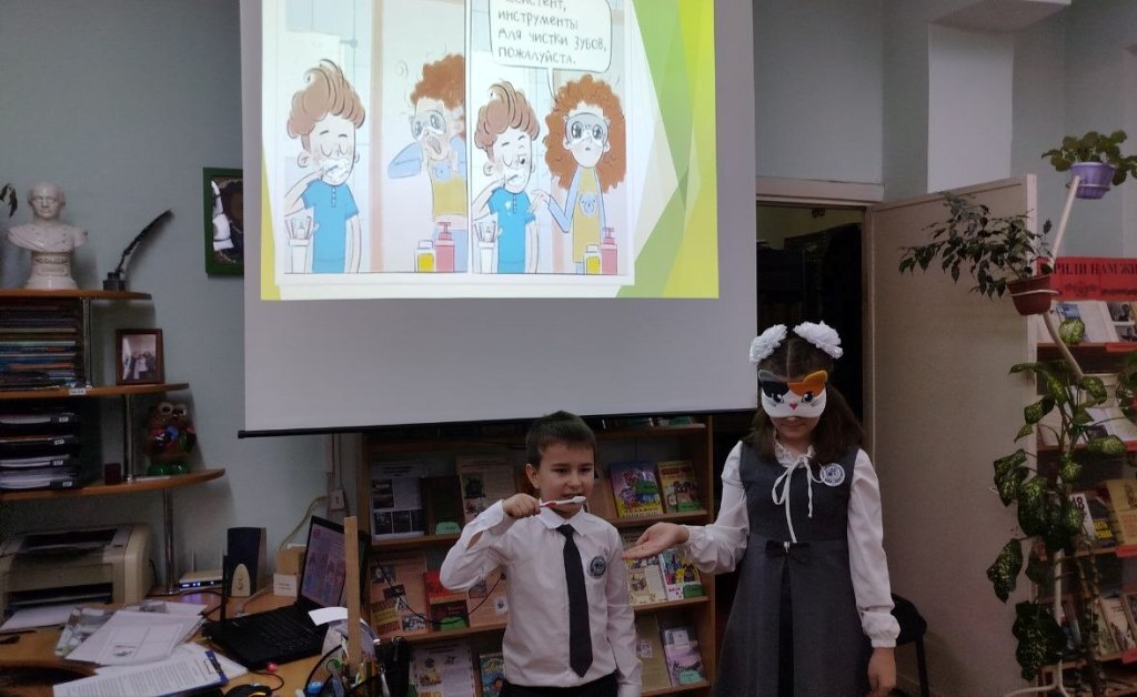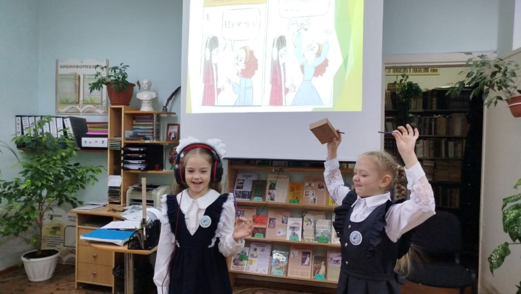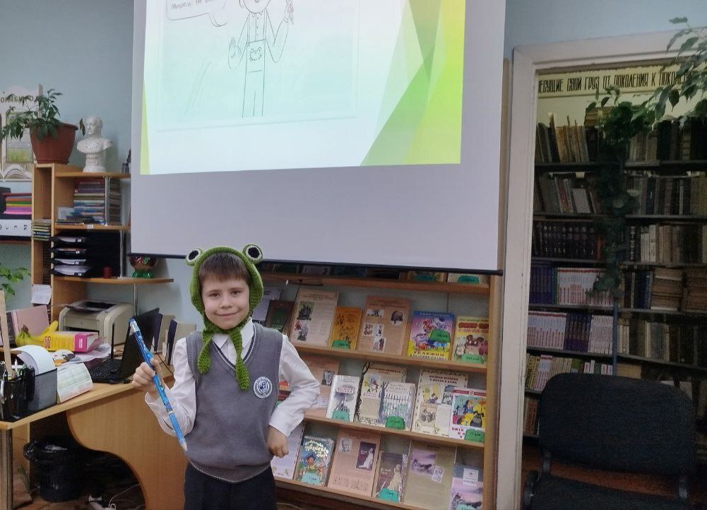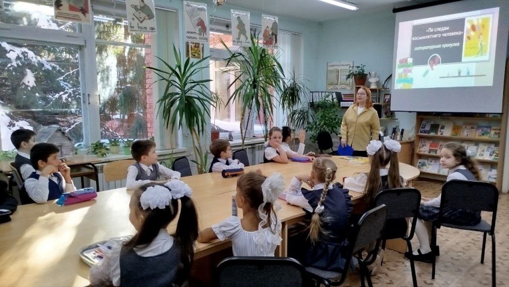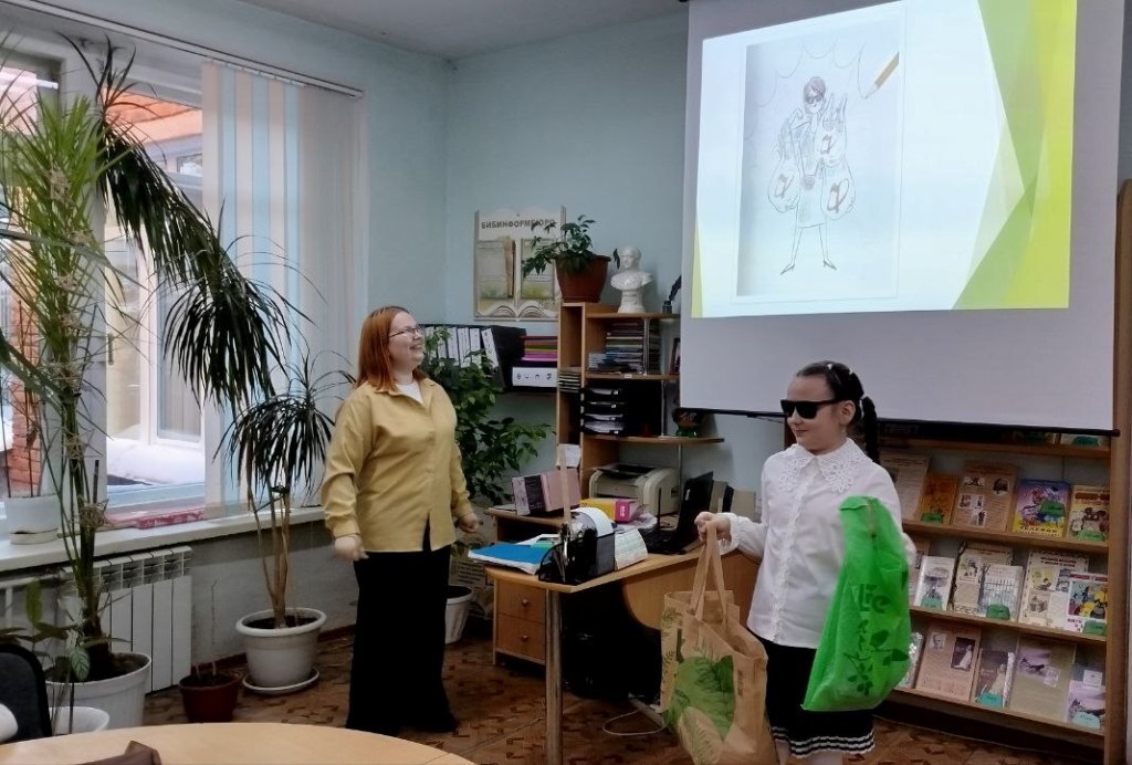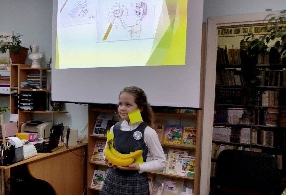 Затем библиотекарь рассказала ребятам о Дане Тихомирове, главном герое книги «Восьмилетний человек», его маме, папе, сестрах Ульяне и Полине, бабушке и таксе Клеопатре.