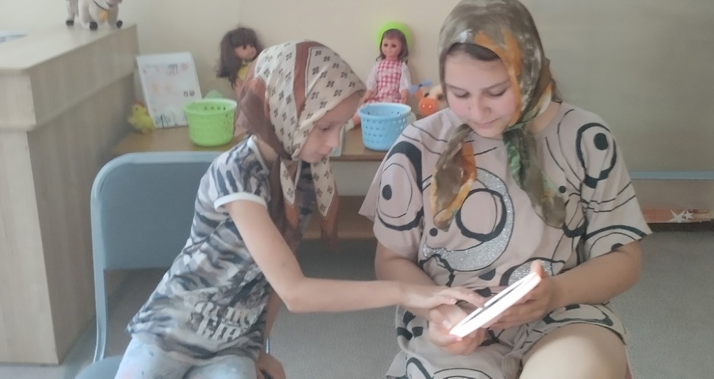 Девочки из пришкольного лагеря тоже захотели примерить платочки и посмотреться в зеркало.