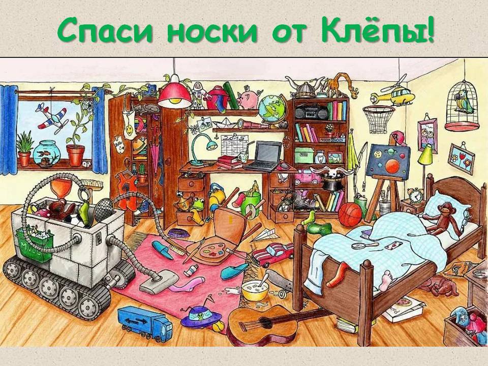Узнав о выступлении «дрессированного» ежа на уроке, юные посетители начинали спасать носки от собаки Клёпы, т.к. Даня похвастался, что выучил её некоторым трюкам, а она только таскала эти предметы гардероба и жевала их в укромных уголках. На экране было изображение детской, где царил хаос, а носки были даже под потолком. Надо было их найти и показать.