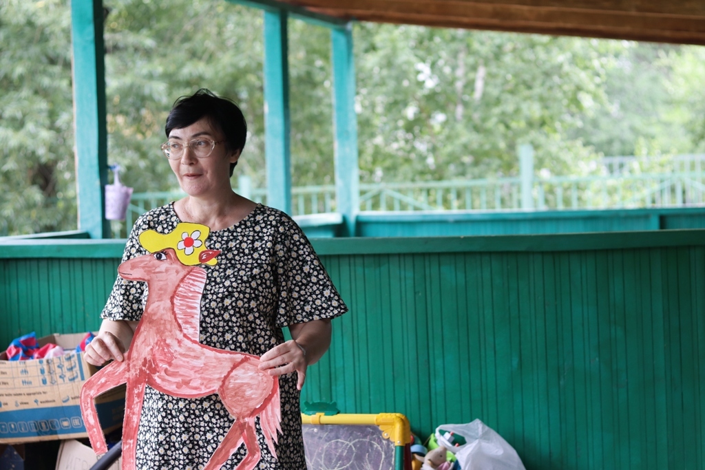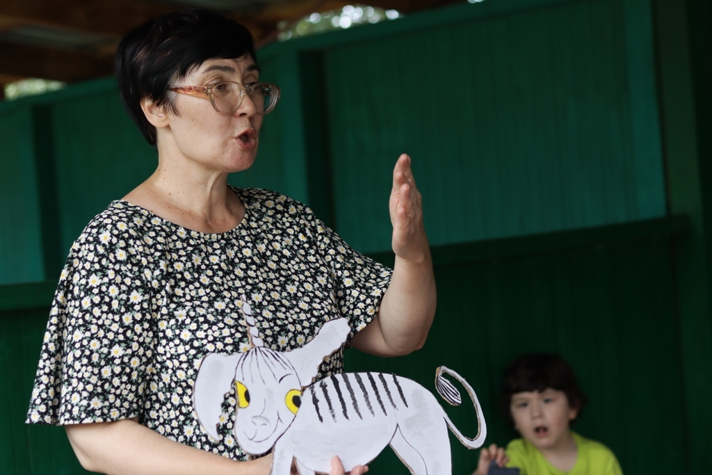 Сначала ведущая Светлана Ивановна Прокушева познакомила дошколят с жеребёнком Мишей, который научил их скакать и… делиться конфетами!