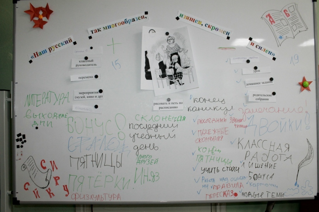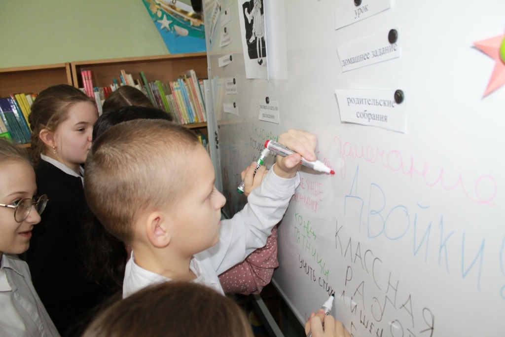 Мнения разделились, и было принято решение найти школьные плюсы и минусы. Ребята раздумывали и с воодушевлением писали на доске свои варианты.