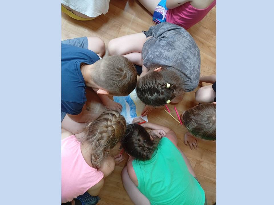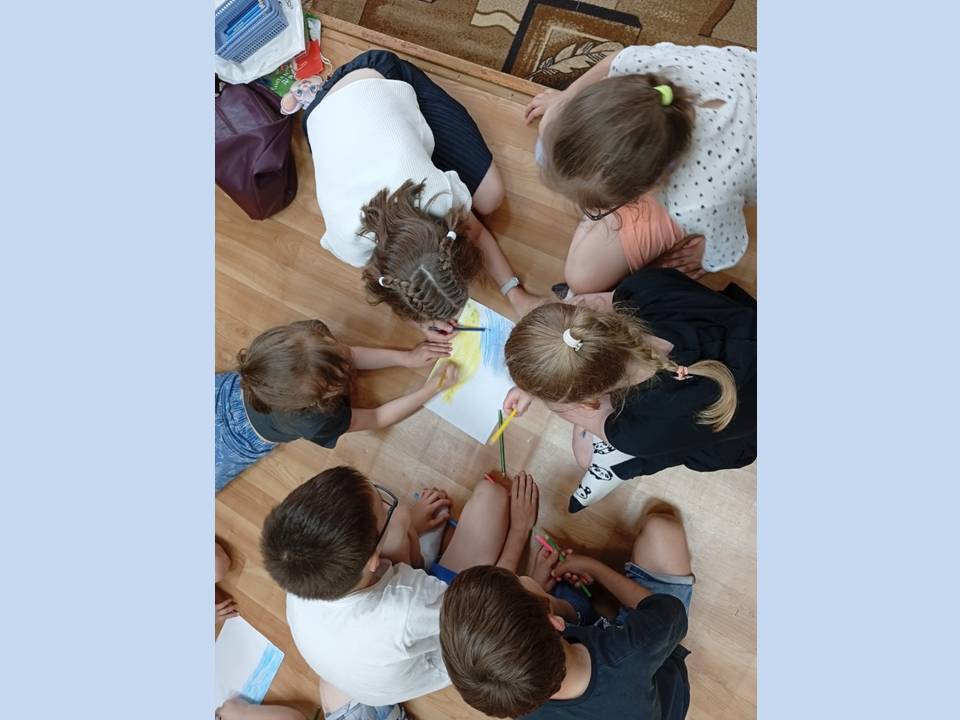 И ребята приступили к работе. Многие долго настраивались, ведь стояла непростая задача, а такая, чтобы, поработав всем вместе, создать готовую картину.