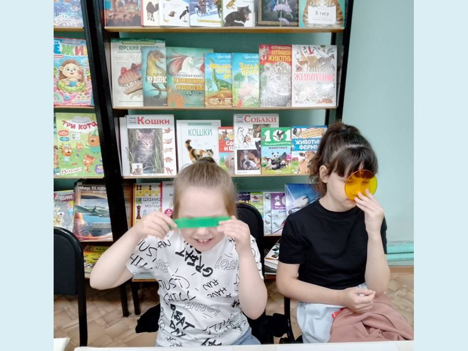 А ещё в библиотеке устроили настоящее волшебство! Чтобы почувствовать, как меняется мир в разные цветные дни из сказки, ребята получали разноцветные стеклышки.