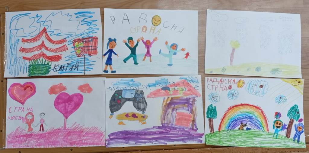 А после ждала неожиданная встреча с загадочными человечками, у них, оказывается, есть Добрая, Злая, Весёлая и Грустная страна. Тут решили немного пофантазировать и придумать свои страны, и это тоже получилось! Развернулась работа, было много обсуждений, эмоций и даже криков, кто что будет рисовать, карандаши скрипели, а на листах постепенно стали появляться удивительные сказочные страны.