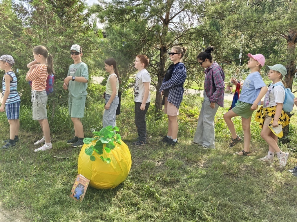 - Сейчас мы с вами отправимся в поход за Мишину речку. Наша литературная прогулка состоится по книге Радия Погодина «Земля имеет форму репы», и поэтому мы захватим с собой в путешествие главный атрибут – огромную репу и всё, что нам пригодится во время путешествия.