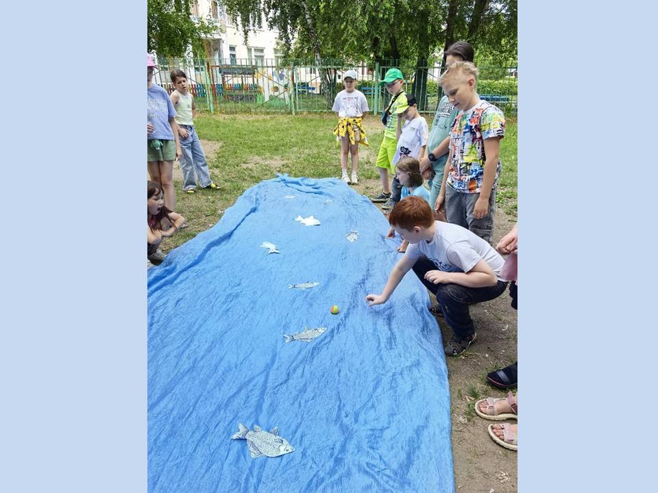 Библиотекарь. Предлагаю вам выполнить задание – выловить с помощью наживки (попасть мячиком) рыбку и ответить на вопрос.